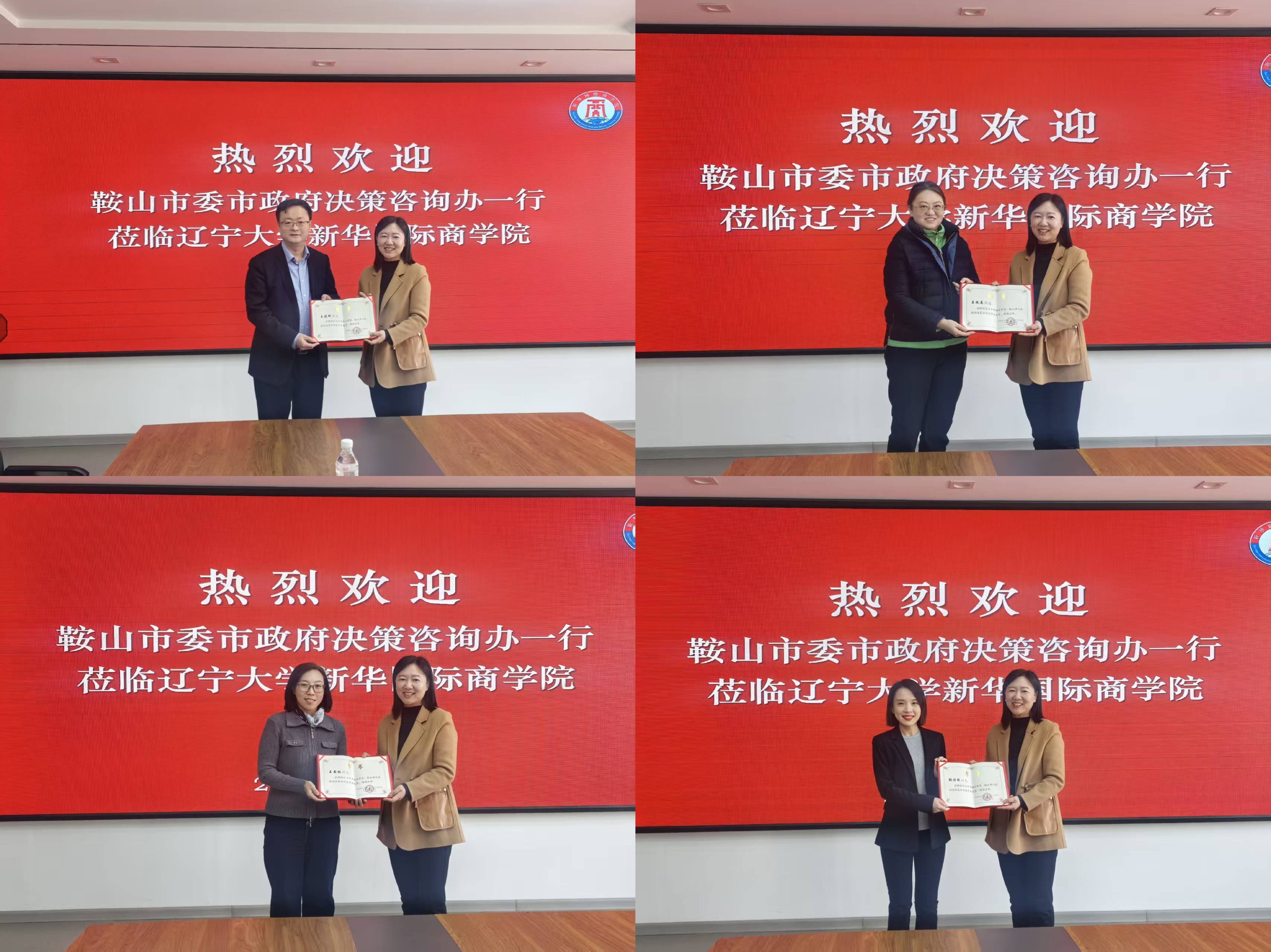 孙毅副主任宣布学院四名教师受聘为鞍山市委、市政府决策咨询委员会委员,为他们颁发聘书,对新华国际商学院在服务鞍山经济发展中作出的突出贡献表示衷心感谢,希望学院围绕鞍山市经济社会发展中的重点难点问题,继续为鞍山市高质量发展提供可操作、能落地的政策建议。